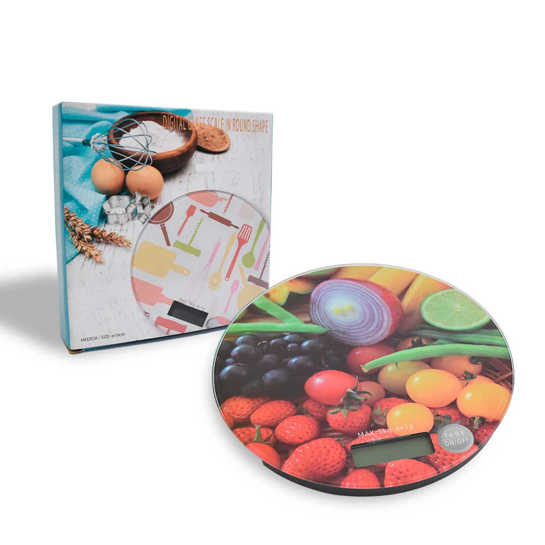 BALANZA COCINA DIGITAL REDONDA VIDRIO 18.5CM 3-4 DISEÑOS HASTA 5KG 25863 Q24