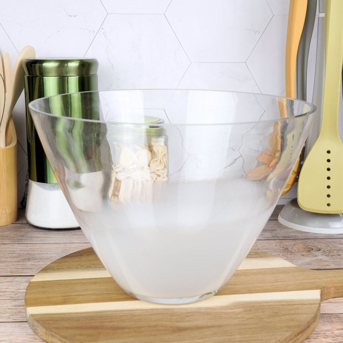 BOWL VIDRIO CONICO GRUESO 27CM DIAM 18.7CM ALTO BASE BLANCA 2265GR 34168 Q4M4