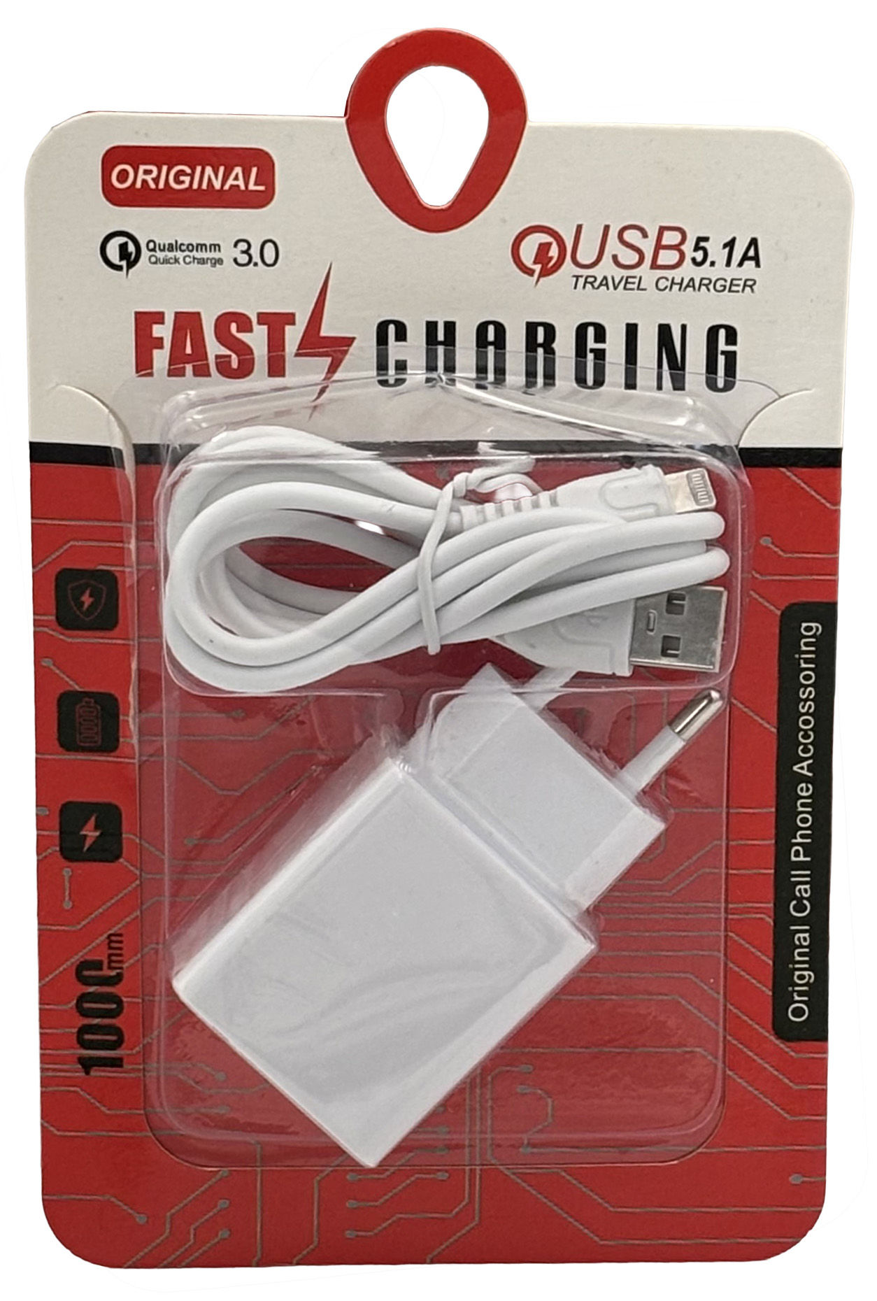 CABLE CARGADOR P/CELULAR FICHA C/USB + CABLE 1MT IPHONE BLISTER 34883 Q100