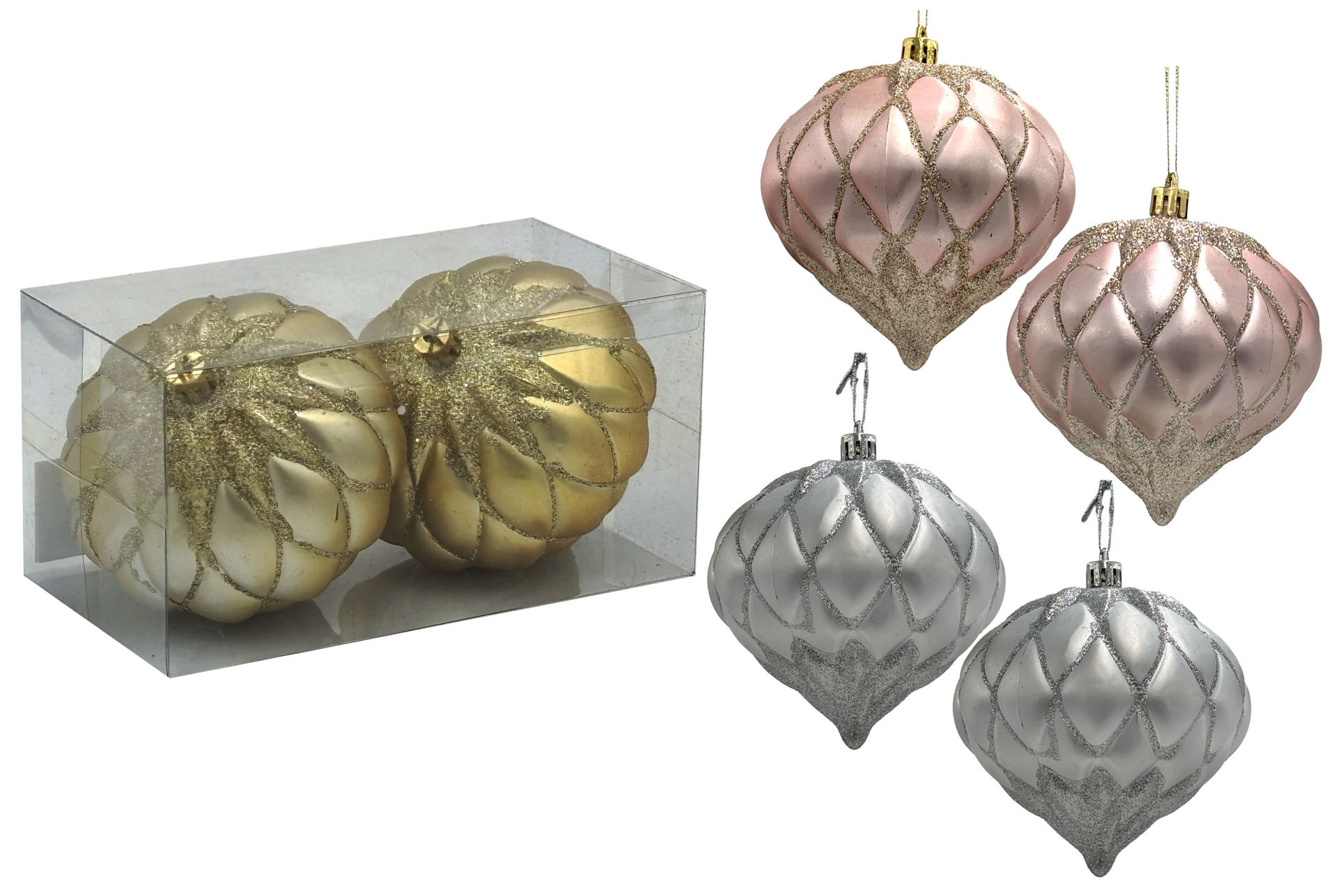 ESFERA 10CM X 2PCS TIPO TROMPO DECORADA C/GLITTER CAJA PVC 9X8.5X17.5 34704 Q40