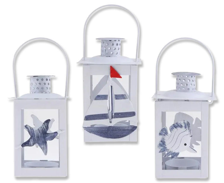 FAROL METAL Y VIDRIO P/VELA BCO C/PECES Y ASA 8X8X15.5CM DECO MARINO 34815 Q48