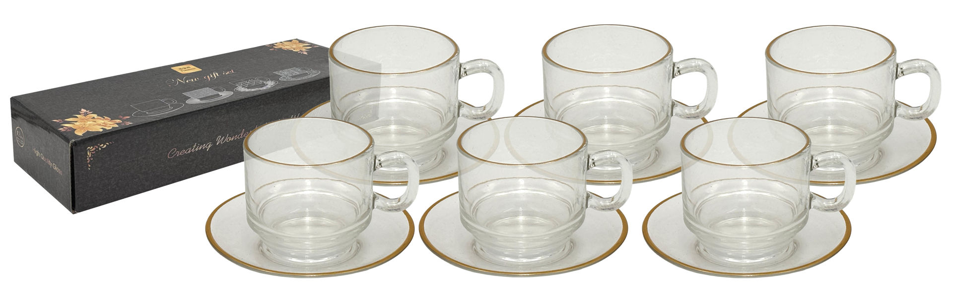 JUEGO CAFE 12PCS VIDRIO LISO BORDE DORADO TAZA 7X6CM + PLATO 11.5CM 35163 Q12