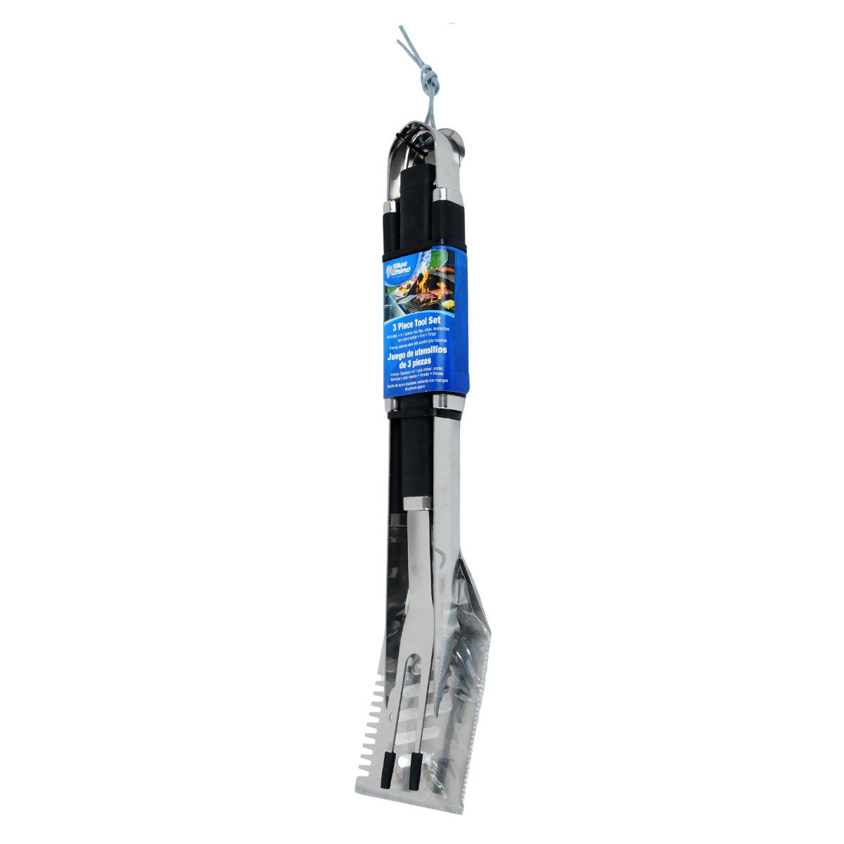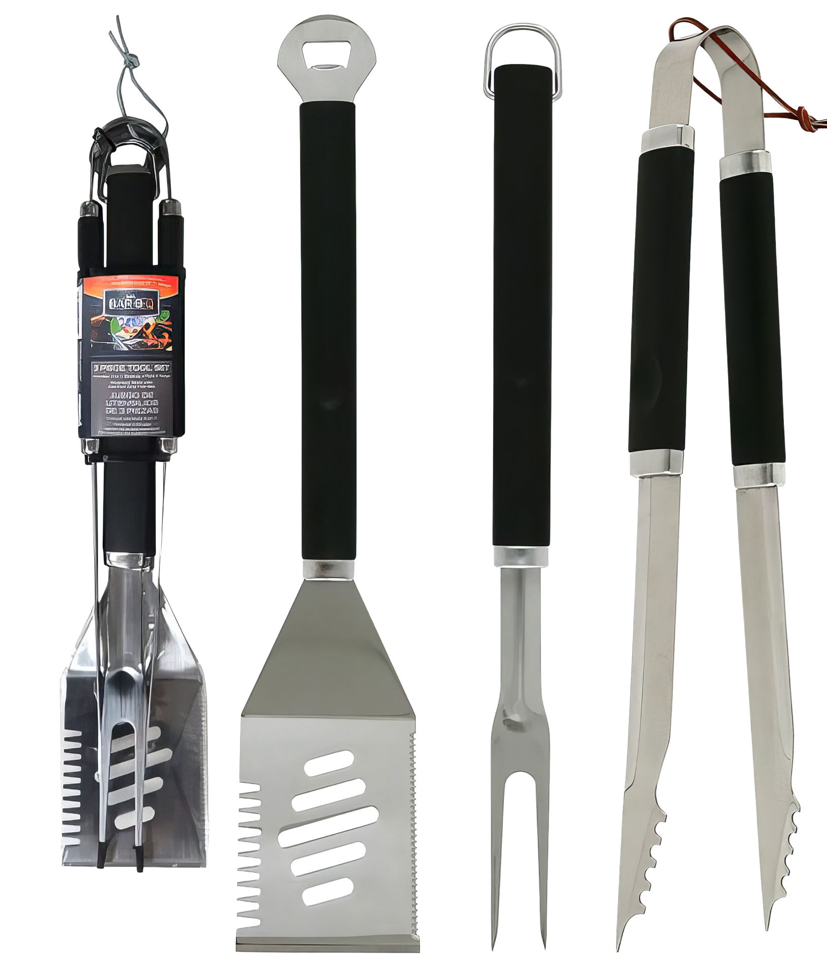 SET PARRILLERO 3PC ACERO ESPATULA PINZA TENEDOR 694GR 46.5X9CM BBQ 34385 Q8