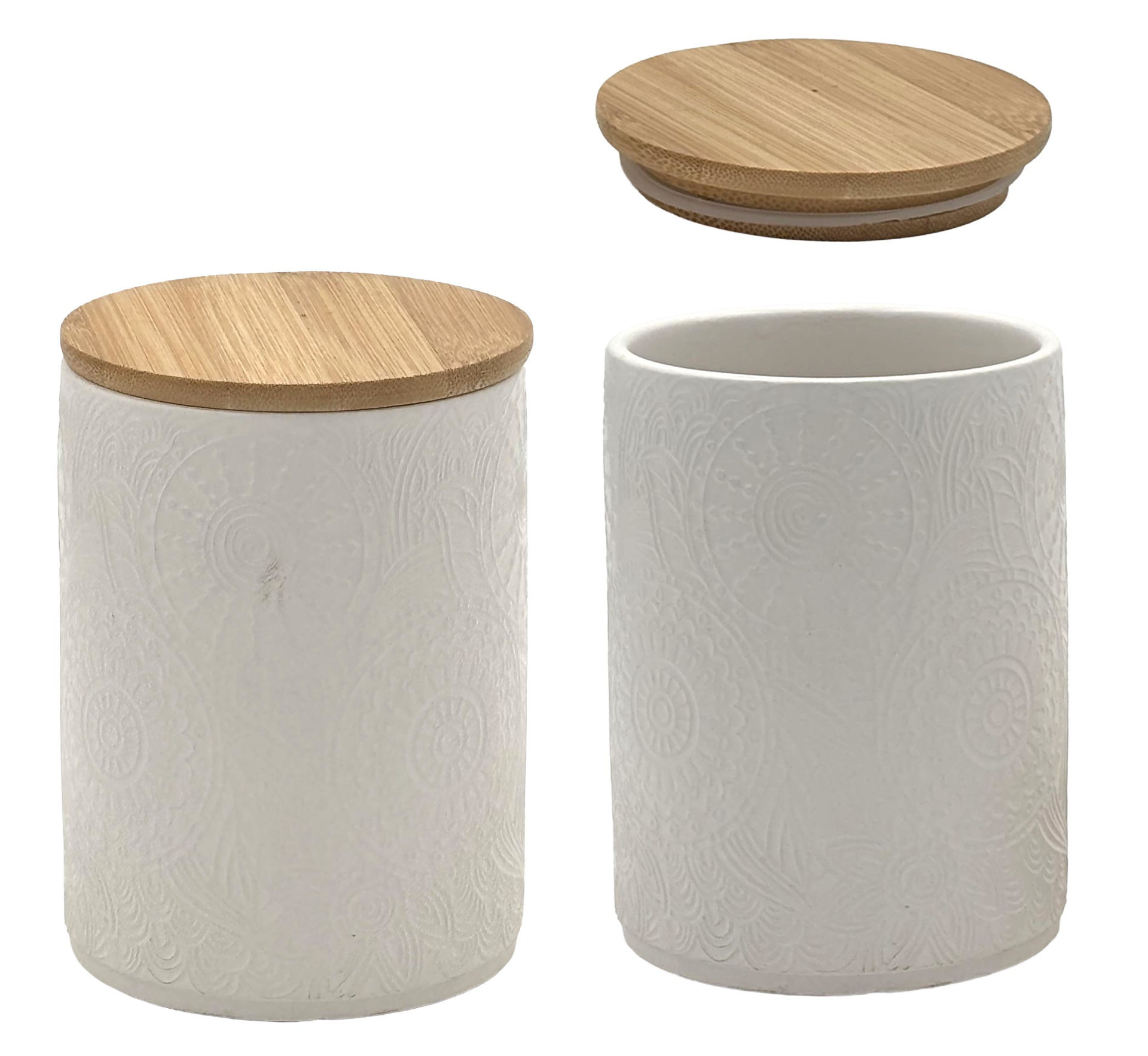 TARRO CERAMICA BCA LABRADO SOL C/TAPA BAMBOO 10X14CM RP25-7 Q48M6