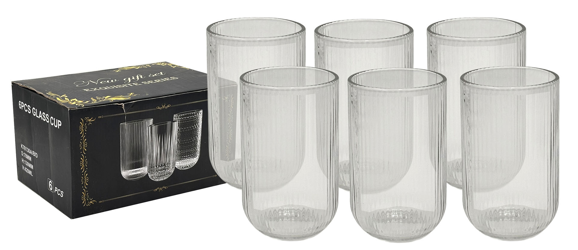 VASO LARGO X6PCS VIDRIO LABRADO LINEAS VERTICALES 420ML 7.8X13CM 35225 Q8