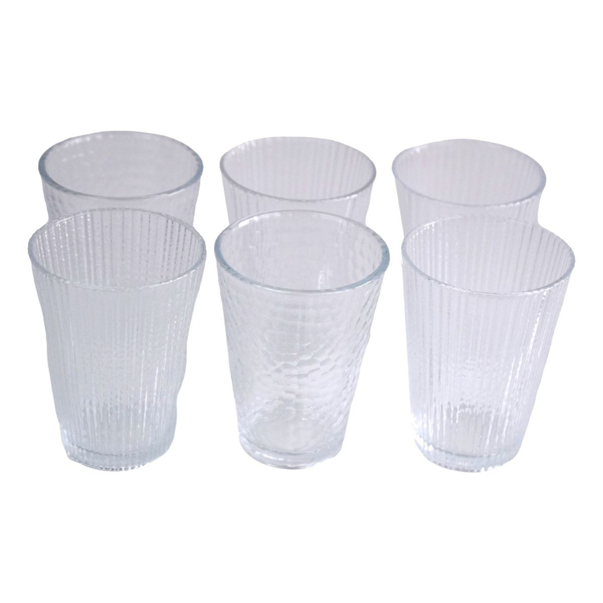 VASO VIDRIO X6PCS 290ML 6.8X9CM 783GR LABRADO 3 DISEÑOS 36706 Q12M12